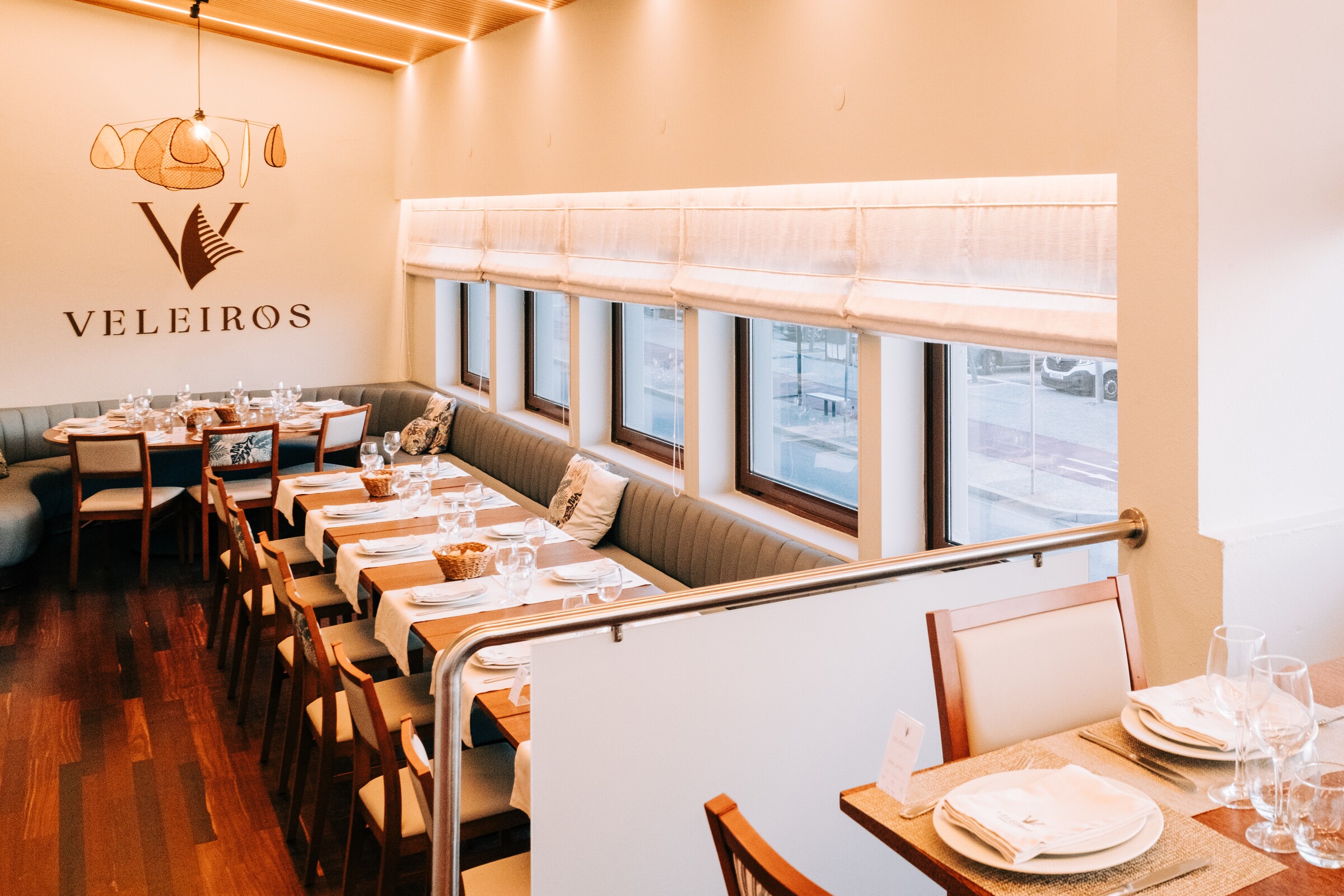 O Restaurante Veleiros apresenta-se num edifício de tons escuros por fora e claros por dentro.