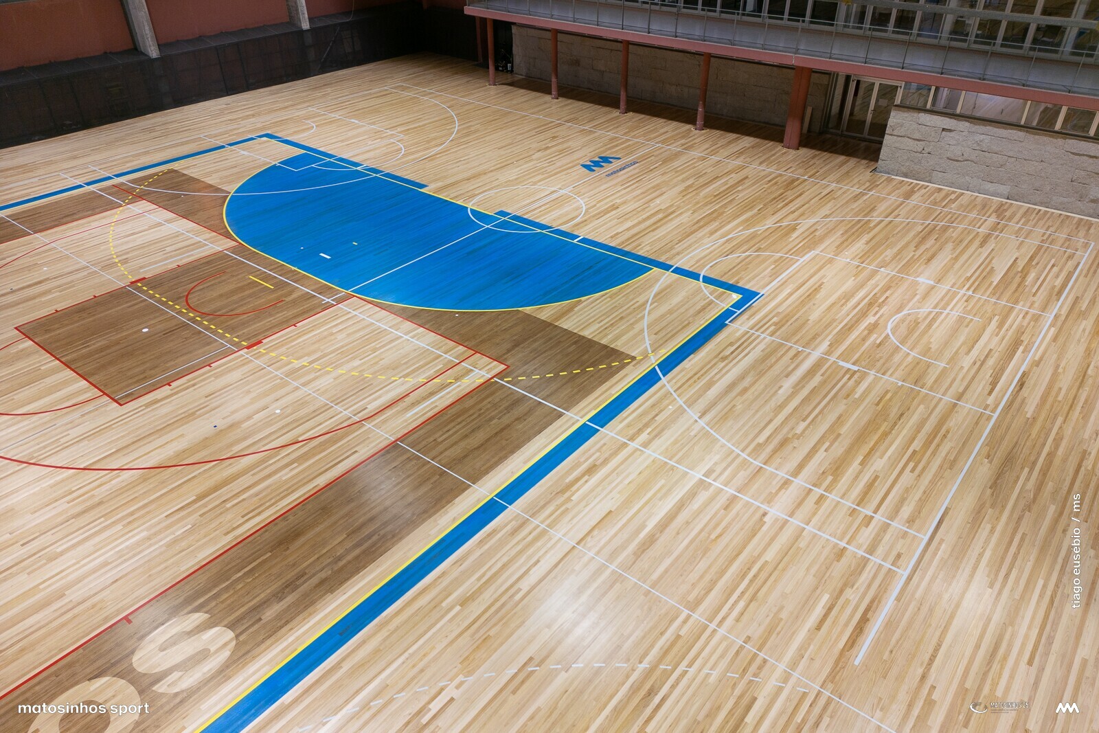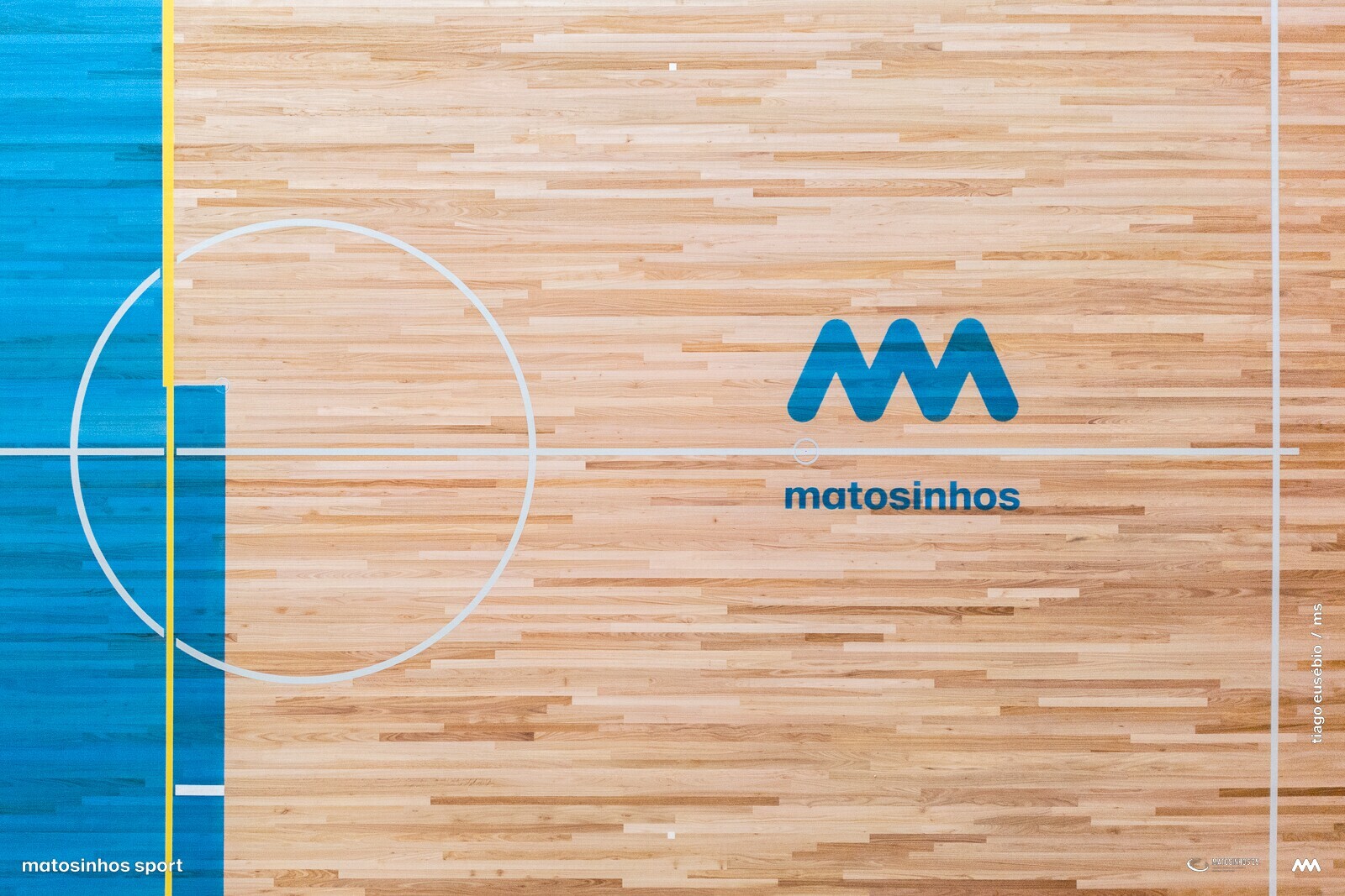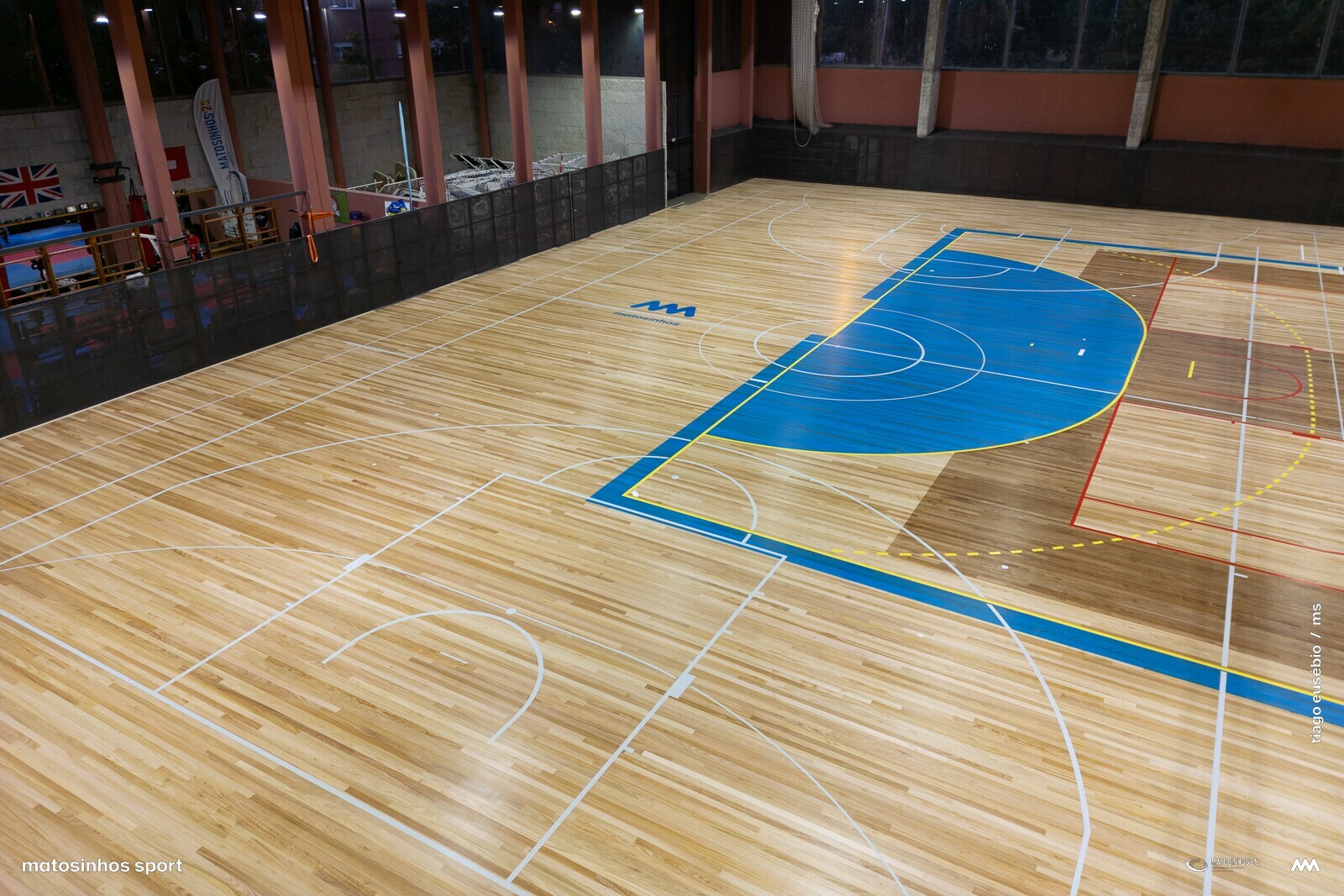 Terminou a empreitada da substituição do piso desportivo com a aplicação de mais de 2.200 metros quadrados de eucalipto "Eucalyptus globulus", identificada ao centro pelo nome e marca do concelho.